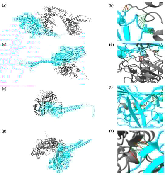 Visualized results of protein interactions between CiSRB1 and GCRV particles by UCSF ChimeraX. The interactions are depicted as follows: (a) CiSRB1 and VP5, (c) CiSRB1 and VP7, (e) CiSRB1 and VP7G, and (g) CiSRB1 and VP5H; panels (b), (d), (f), and (h) are magnifications of panels (a), (c), (e), and (g), respectively. In the visualizations, the blue protein chain represents the CiSRB1 protein, and the gray protein chain represents the outer capsid protein from different typical GCRV strains. The red dashed lines between the two protein chains represent hydrogen bonds, and the green dashed lines indicate various polar and nonpolar interactions between the molecules.
