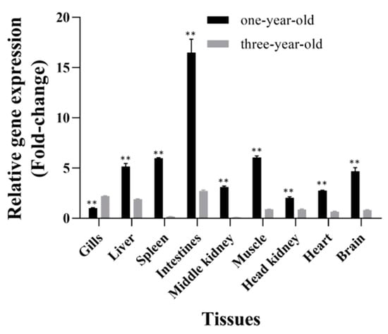 Tissue distribution of CiSRB1 in healthy one-year-old and three-year-old grass carp. Data are expressed as the ratios of CiSRB1 mRNA expression in each tissue relative to its expression in the gills from one-year-old fish. Significant differences in CiSRB1 expression between samples from one-year-old and three-year-old fish were analyzed by one-way ANOVA followed by Dunnett’s multiple comparisons post-test. ** indicates p < 0.01.
