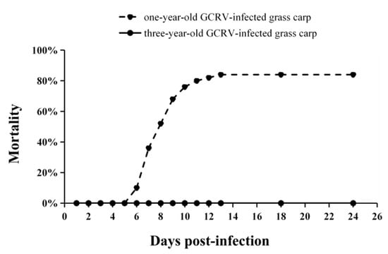 Mortality rates of one-year-old and three-year-old grass carp after GCRV infection. The number of deceased grass carp in each group was monitored daily until no deaths were recorded for two consecutive weeks.