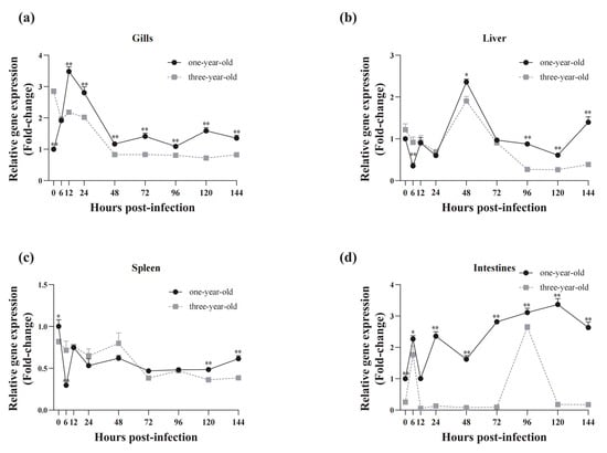 Temporal expression analysis of CiSRB1 in immune tissues from one-year-old and three-year-old carp after GCRV infection. The mRNA levels of CiSRB1 in the gills (a), liver (b), spleen (c), and intestines (d) 0~144 hpi were subjected to qPCR analysis. Expression levels of CiSRB1 in the healthy samples from one-year-old fish (0 hpi) were set to 1.00, and β-actin served as an internal control to normalize the relative expression levels of the target genes. The results are based on three independent experiments and are expressed as means ± SD. Significant differences in CiSRB1 expression between the samples from the one-year-old and three-year-old fish were analyzed by one-way ANOVA followed by Dunnett’s multiple comparisons post-test. ** indicates p < 0.01, and * indicates p < 0.05.