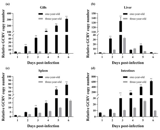 The relative GCRV copy numbers in four tissues (gills, liver, spleen, and intestines) were examined by qPCR by using specific primers for the M6 segment of the GCRV-HZ08 strain to determine the GCRV infection status of GCRV-infected grass carp. Minor differences in the GCRV copy numbers of gills, liver, and spleen were observed between one-year-old and three-year-old grass carp 1 dpi, indicating that the GCRV dose used for injection was appropriate (Figure 9). In one-year-old infected fish, the GCRV relative copy numbers in gills (Figure 9a), spleen (Figure 9c), and intestines (Figure 8d) showed an increasing trend and peaked 6 dpi during the tested period. However, the GCRV relative copy numbers in the liver followed a parabolic trend, reaching a maximum 3 dpi and then decreasing to the original level 6 dpi (Figure 9b). In three-year-old carp, the GCRV levels remained quite low in the gills throughout the infection (Figure 9a), and a similar parabolic curve was observed for the liver (Figure 9b). The GCRV copy numbers in the spleen increased after infection in the three-year-old fish, although they were significantly lower than those in the one-year-old fish. Similarly, the GCRV RNA levels gradually increased to their peak in the intestines 5 dpi before declining 6 dpi (Figure 9d). In general, the relative copy numbers of GCRV in the tissues of the three-year-old grass carp were significantly lower than those in the one-year-old grass carp after GCRV infection.