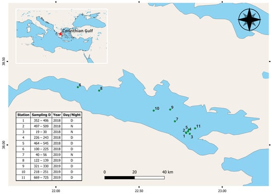 The Corinthian Gulf is a deep (>930 m) isolated basin, located at the east end of the Ionian Sea (central Mediterranean Sea, Greece). The Gulf’s mesopelagic fish fauna includes 15 species belonging to the families Myctophidae, Paralepididae, Sternoptychidae and Stomiidae []. Fish samples were collected in the Corinthian Gulf during November 2018 and April 2019 onboard the R/V PHILIA. The main sampling gear was a pelagic trawl with a 12 m × 7 m mouth opening and a 16 mm mesh (stretched) on the cod end. In addition, two hauls were performed with a smaller Sardonet pelagic trawl (mouth opening: 3.7 m × 2.1 m, mesh: 5 mm stretched) and two more with a scaled-down version of a Methot frame trawl [] (1.5 m × 1.5 m frame, mesh: 1 mm stretched), aiming to capture smaller individuals. Sampling was carried out during both day and night (from dusk till dawn; see Figure 1 for individual station sampling times) and sampling depths ranged between 10–725 m (bottom depths: 150–865 m) (Figure 1). More sampling details are provided in Kapelonis et al. [].