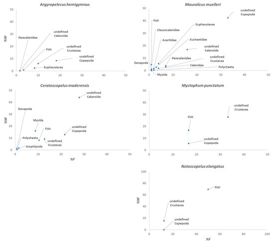 Finally, the importance of the identified prey items in the diet of each predator was depicted in two-dimensional Costello graphs by plotting the gravimetric contribution (%W) of each prey type against its frequency of occurrence (%F) in the species’ diet []. Prey type significance, as well as diet indices and analyses, were determined and performed for broader taxonomic prey groups, which were common for most investigated species, down to the rank of the taxonomic order, where identification was possible.
