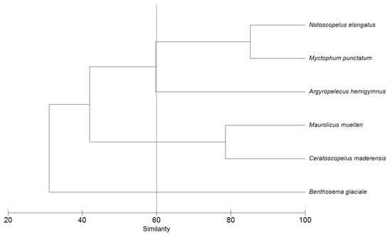 PERMDISP analysis showed significant dispersion of prey item abundance data (F: 27.01, df number of groups = 5, df number of samples = 126, p < 0.001). Average within-species similarity, determined with SIMPER analysis, was low for all species (Table 4), ranging from 28.30 in A. hemigymnus to 35.33 in M. muelleri, with the exception of B. glaciale, for which the level of taxonomic resolution of prey did not permit for the observation of variation between individual specimens. Between-species cluster analysis showed high similarities between M. punctatum and N. elongatus and between C. maderensis and M. muelleri (>75%, Figure 3) in terms of prey item relative abundance. The main contributors to most species pairs’ diet dissimilarity proportions were calanoids and unidentified copepods, while, in the case of N. elongatus, fish were the most prominent differentiating prey group, when compared with other species (Table 5).