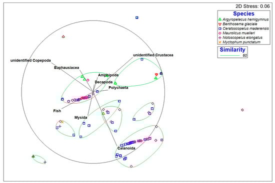 Non-metric multidimensional scaling (nMDS) of prey numerical abundance (N) in the diet of the six mesopelagic fish species sampled from the Corinthian Gulf. Plotted vectors indicate correlations between prey composition items and the ordination of investigated mesopelagic specimens by applying the Spearman’s rank correlation coefficient. Overlay cluster contours are drawn at 60% Bray-Curtis similarity.