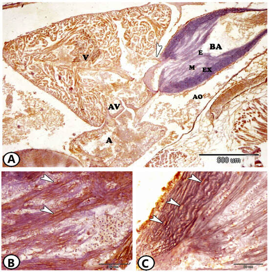 Interestingly, previous studies have shown that the structure of the bulbus arteriosus is nearly species-specific [32,33,34]. In all studied teleosts, the atrioventricular region is identifiable as a distinct morphological segment situated between the atrium and the ventricle, and the morphological characteristics of this region appear to be species-specific [31]. The atrioventricular region of Molly fish consists of a compact myocardium ring encircled by a connective tissue ring. The myocardium contains vessels in most species with fully trabeculated ventricles [31].