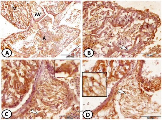 The myocardial cells of the ventricle exhibited the expression of Nrf2 and IL-1β. Nrf2 has been reported to play a role in antioxidation, immunopotentiation, and osmoregulation in fish under salinity stress in addition to its established functions in toxicity and oxidative stress [82,83]. It plays a fundamental role in the regulation of cell inflammatory responses and lipid metabolism [84]. Furthermore, many Nrf2-regulated enzymes play a crucial role in the pathogenesis of cardiovascular diseases [85]. Additionally, Nrf2 can prolong graft survival and modulate both innate and adaptive immune responses following heart transplantation [86]. Nrf2 knockout has been reported in mice to induce structural and functional cardiac alterations [84,87]. IL-1β is secreted by activated endothelial cells, tissue macrophages, blood monocytes, activated T lymphocytes, granulocytes, and other cell types [88], where it plays a major role in initiating local and systemic responses to stimuli through the activation of T and B lymphocytes, macrophages, and natural killer cells [89,90]. Previous studies have shown that the expression patterns of IL-1β vary across different organs in various organisms under normal conditions. For example, in sea bream, a lower expression of IL-1β mRNA has been detected in the kidney, gill, spleen, and intestine, while its expression was absent in the liver, heart, and muscles [91,92]. In Molly fish, the expressions of Nrf2 and IL-1β have been detected in most of the studied tissues [41,42,59,60,66,67,69].