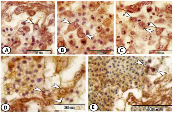 The atrium showed a large proportion of immune cells, including dendritic-like cells that expressed Ach (Figure 3A), macrophages that expressed Ach (Figure 3B), CD68 (Figure 3C), and iba1 (Figure 3D). Moreover, granulocytes could be identified by S100 protein (Figure 3E). We can identify various immune cells according to their morphology. Dendritic cells were characterized by a high nuclear-to-cytoplasmic ratio and the presence of dendrite-like processes. Macrophages were characterized by eccentric nuclei and pseudopodia. On the other hand, the granulocytes were observed near RBCs with pleomorphic nuclei and some pseudopodia.