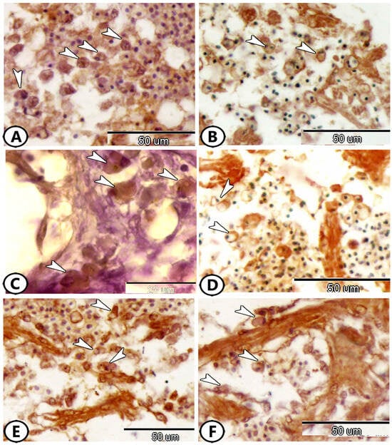 Furthermore, telocytes (TCs) have emerged as a significant component of the atrium. These unique interstitial cells were characterized by a cell body containing an oval nucleus and long cell processes called telopodes. TCs and their telopodes expressed Ach (Figure 5A), S100 protein (Figure 5B), CD68 (Figure 5C,D), and iba1 (Figure 5E,F).
