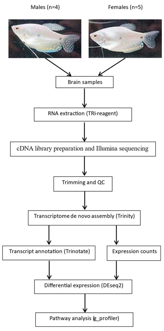 The following supporting information can be downloaded at https://www.mdpi.com/article/10.3390/fishes9070287/s1: Supplementary File S1: Sequencing and transcriptome assembly stats; Supplementary File S2: DESeq2 stats; Supplementary File S3: DESeq2 results—brain, M vs. F; Supplementary File S4: g.profiler tables, up- and down-regulated in M vs. F; Supplementary File S5: primer sequences.