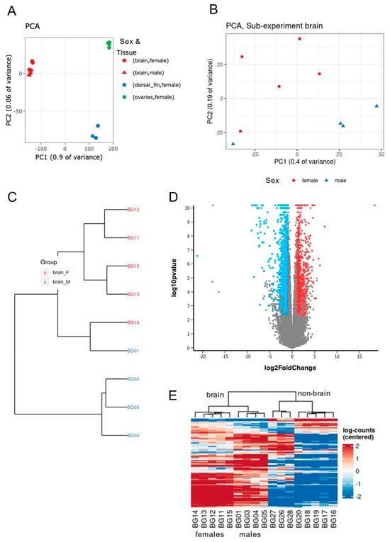 Adult gourami brain transcriptomes tend to cluster by sex. (A) PCA of all tissues; (B) PCA of brain samples; (C) hierarchical clustering (HCL) of brain samples; (D) volcano plot of brain DEseq2 results (male vs. female, significantly up- or down-regulated genes in red and blue, respectively); (E) heatmap of significantly DE genes from DEseq2 results (all tissues).