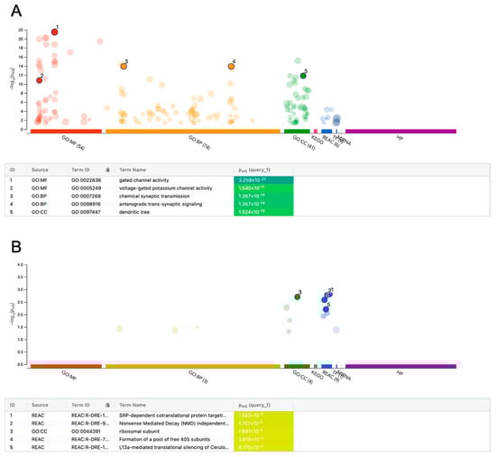 G.profiler graphs and compact tables of selected over-represented terms among genes that were (A) down-regulated and (B) up-regulated in male vs. female gourami brains.