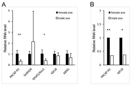 A. Relative mean mRNA abundance (based on RT-qPCR), in female and male gourami brains, of hormone receptors as follows: pacap-r1 (pituitary adenylate cyclase-activating polypeptide receptor 1), gnrh2r (gonadotropin-releasing hormone receptor), gpar1/kiss1 (G protein-coupled receptor 1 (A), igf1r (insulin-like growth factor 1 receptor), and mpr1 (membrane progesterone receptor 1). *: p = 0.01; **: p = 0.0038 (t-test). Bars, stdev (N = 5). (B): Relative mean mRNA abundance (based on RNA-seq, see Supplementary File S3), in female and male gourami brains, of two of the same hormone receptors (pacap-r1 and igf1r). *: p = 0.0153; **: p = 0.0002 (adjusted p-values, DESeq2).