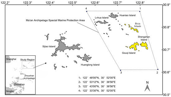 Geographical positioning of Shengsi and the Ma’an Islands National Marine Special Reserve (the yellow area is designated as the pilot area for the Island Reefs Fishery Lease Policy).