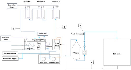Figure 1. Water flow and process design of a replicated Alpha Aqua RAS. Location for water sampling in the pre-trial is highlighted as follows. A: before the fish tank, B: after the fish tank, C: after the drum filter and D: after the biofilter.