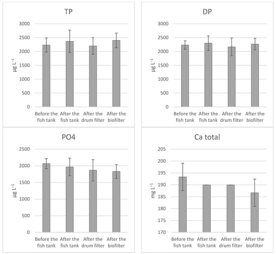 Figure 2. The distributional pattern of total phosphorus (TP), dissolved phosphorus (DP), orthophosphate (PO4), zinc (ZN), calcium (Ca), and magnesium (Mg) in production water of RAS stocked with Atlantic salmon (Salmo salar) at 13 °C, fed an ERAS diet. Represented by sampling locations in water treatment before the fish tank, after the fish tank, after the drum filter, and after the biofilter. Data are expressed as average ± SD (n = 3).