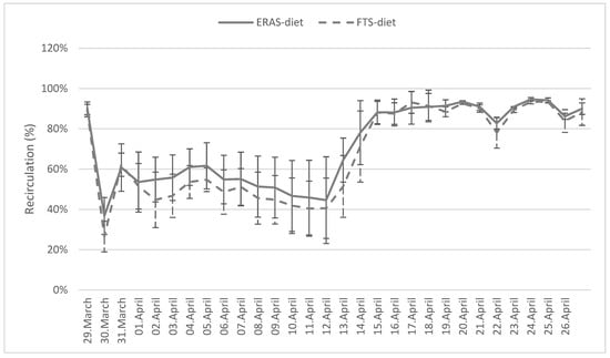 Figure 3. Daily average degree of recirculation for RAS units with Atlantic salmon post-smolt fed an ERAS diet and an FTS diet in a period of four weeks. From 12 April, manual drum filter cleaning was initiated on a daily basis. Data are expressed as average ± SD (n = 3).