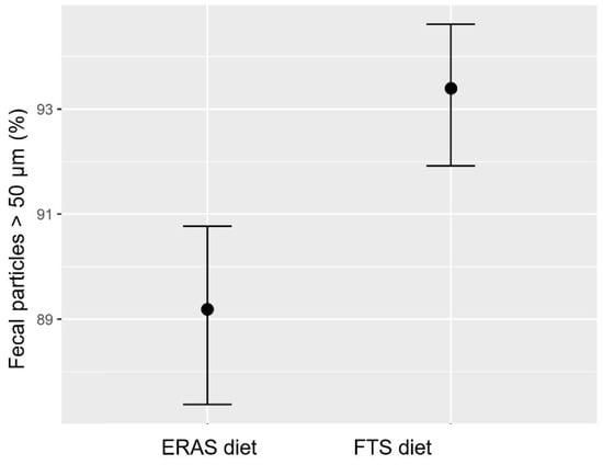 Figure 4. Mastersizer comparison of fecal stability for the ERAS diet and FTS diet. Expressed as percentage probability of generating particles less than 50 μm when passing through a drum filter ± SD (n = 3). The ci are calculated by simulation and denote the 95% ci for the mean of each sample.