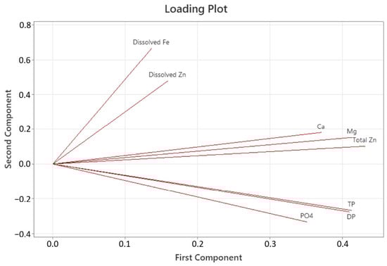 The first principal component accounts for 59.0% of the total variance (Figure 5). The second principal component accounts for 23.9% of the total variance. The PCA for the mineral and metal accumulation shows that three different groups were connected. The first group encompassed the dissolved Zn and Fe, and the second group encompassed the Ca, Mg, and total Zn. The third and last group encompassed the various P components.
