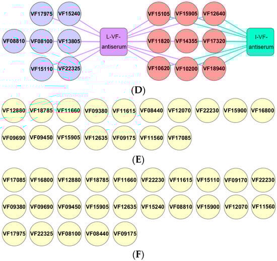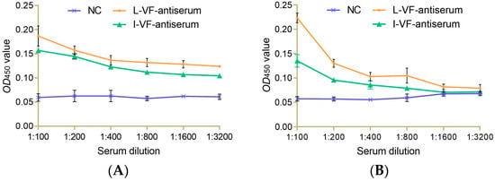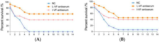 V. fluvialis cells were collected after overnight cultivation, suspended in a 1% formaldehyde solution, inactivated in an 80 °C water bath for 90 min, and suspended in normal saline (0.9% NaCl). The mice were immunized with 100 μL of live or inactivated V. fluvialis (5 × 106 CFU) via intraperitoneal injection. Immunization was performed thrice at 14-day intervals. After the third immunization, the mice were anesthetized, and blood was collected from the eyeballs. The mouse blood was coagulated at 4 °C overnight. After centrifugation at 3000 r/min, the live V. fluvialis mouse antiserum (L-VF-antiserum) and inactivated V. fluvialis mouse antiserum (I-VF-antiserum) were obtained and stored at −80 °C [].