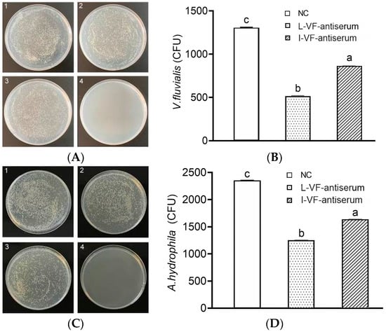 Bacterial count in C. auratus’ kidneys. (A,B) The bacterial colony and the bacterial count statistics for V. fluvialis, respectively. (C,D) The bacterial colony and the bacterial count statistics for A. hydrophila, respectively. Labels 1–3 represent the blank mouse antiserum as the control, the live mouse antiserum, and the inactivated mouse antiserum, respectively. Label 4 represents a kidney without challenge from bacteria. Labels a–c indicate statistically different groups (p < 0.05).
