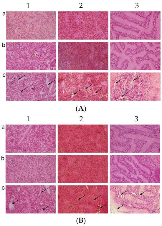 Pathological sections of the C. auratus visceral tissues. (A,B) The C. auratus that were challenged with V. fluvialis and A. hydrophila, respectively. Labels a–c represent fish administered live mouse antiserum, inactivated mouse antiserum, and blank mouse antiserum as a control, respectively. Numbers 1, 2, and 3 represent kidney, spleen and intestine, respectively. In the control group, the kidney (A1c,B1c), spleen (A2c,B2c), and intestine (A3c,B3c) exhibited structural incompleteness and cell apoptosis. The visceral tissues were intact without cell apoptosis in the live and inactivated mouse antiserum groups.
