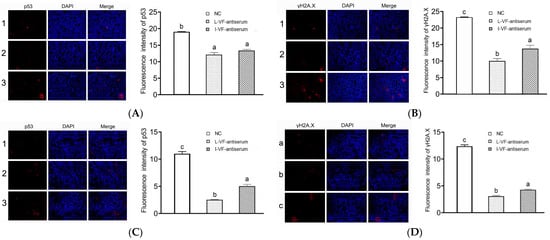 Immunofluorescence of p53 and γH2A.X in the kidney cells. (A,B) Challenges with V. fluvialis. (C,D) Challenges with A. hydrophila. Labels 1–3 represent the C. auratus administered the live mouse antiserum, inactivated mouse antiserum, and blank mouse antiserum (control), respectively. Labels a–c indicate statistically different groups (p < 0.05). The immunofluorescence of p53 and γH2A.X decreased (p < 0.05) compared to the control, and the immunofluorescence with the live mouse antiserum was lower than that with the inactivated mouse antiserum.