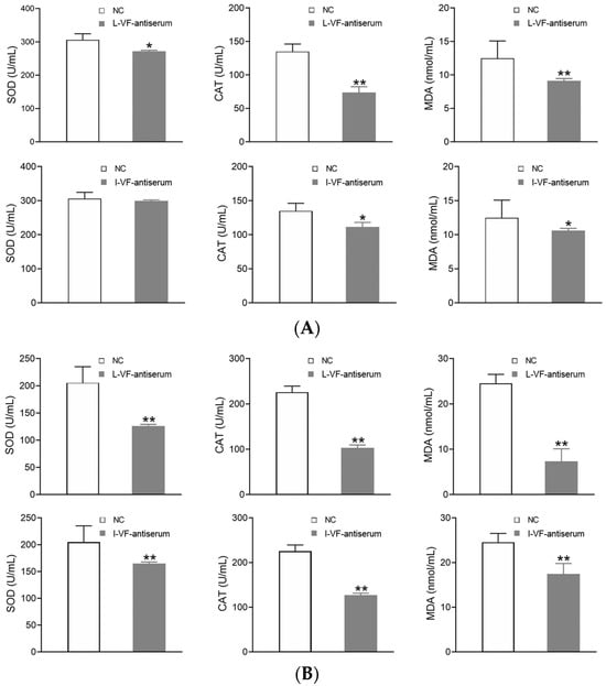 The activity of the antioxidant factors in the C. auratus serum. (A,B) represent challenges with V. fluvialis and A. hydrophila, respectively. * p < 0.05 and ** p < 0.01 (compared with the control). The activity of most antioxidant factors (i.e., SOD, CAT, and MDA) decreased (p < 0.05).