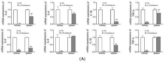 mRNA expression of the inflammatory genes in the kidney and spleen of C. auratus. (A,B) Challenges with V. fluvialis and A. hydrophila, respectively. ** p < 0.01 (compared with the control). The mRNA expression of the inflammatory genes generally decreased (p < 0.05).