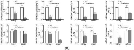 The kidneys and spleens of C. auratus were obtained on Day 2 after the fish were administered mouse antisera and challenged with bacteria. In the treatment groups, the mRNA expression of inflammatory genes (i.e., IL-6, IL-8, TNF-α, and IL-1β) was decreased (p < 0.05) compared with the control group (Figure 7). Thus, the live and inactivated mouse antisera promoted anti-inflammatory activity in C. auratus.