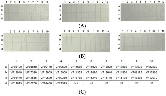 The nitrocellulose (NC) membrane was arrayed into uniformly sized squares of 0.7 cm × 0.7 cm. The protein array consisted of a 4 × 10 matrix with 40 squares, including 34 outer membrane proteins (Table S1) and 6 squares as controls (Figure 8C). A total of 34 purified outer membrane proteins (OMPs) of V. fluvialis were adjusted to a concentration of 0.25 μg/μL, and 2 μL of the solution was added to the squares of the NC membrane. A 5% BSA solution was used to seal the NC membrane at room temperature for 2 h. Then, the NC membrane was incubated with mouse antisera (1:200) at 37 °C for 1 h. After washing thrice, a secondary antibody (1:2000) was added to the NC membrane at 37 °C for 1 h. Finally, the NC membrane was stained with a DAB solution [].