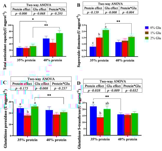 Dietary glutamate did not significantly affect the total antioxidant capacity (T-AOC) of crabs fed with the diets under both 30% and 35% protein levels (p > 0.05; Figure 1A). However, the crude protein content of diets has a significant main effect on the T-AOC (p < 0.05; Figure 1A). The T-AOC of crabs fed the 30% protein diets was significantly lower than that of crabs fed the 35% protein diets (p < 0.05; Figure 1A). At 30% protein level, the superoxide dismutase (SOD) activity significantly increased with the increase in glutamate content (p < 0.05; Figure 1B) but, at 35% protein level, dietary glutamate did not significantly affect the SOD of crabs (p > 0.05). Under the 2% glutamate condition, the SOD activity in the hepatopancreas of crabs fed 30% protein was significantly higher than that of crabs fed 35% protein (p < 0.05; Figure 1B). At 30% protein level, the glutathione peroxidase (GPX) and glutathione S-transferase (GST) of crabs fed the 1% glutamate diets were significantly lower than those of crabs fed the 0% and 2% glutamate diets (p < 0.05; Figure 1C,D). At 35% protein level, dietary glutamate did not significantly affect the activities of GPX and GST (p > 0.05; Figure 1C).