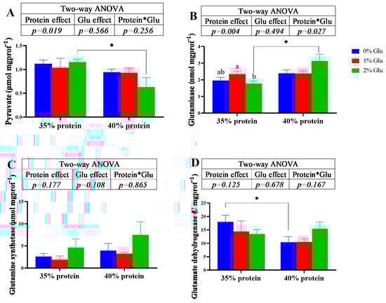 Dietary glutamate did not significantly affect the pyruvate, glutamine synthetase and glutamate dehydrogenase of crabs fed with the diets under both 30% and 35% protein levels (p > 0.05; Figure 2A,C,D). However, the crude protein content of diets has a significant main effect on the pyruvate (p < 0.05, Figure 2A). At 30% protein level, the activity of glutaminase was significantly higher in crabs fed the 1% glutamate diets (p < 0.05; Figure 2B). At 35% protein level, dietary glutamate did not affect the activity of glutaminase (p > 0.05; Figure 2B).