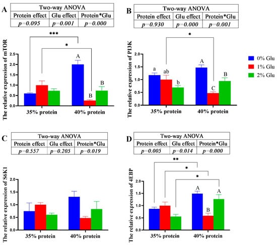 At 30% protein level, dietary glutamate did not affect the relative expressions of mTOR, S6K1 and 4EBP (p > 0.05; Figure 3A,C,D). However, at 35% protein level, dietary glutamate significantly down-regulated the relative expressions of mTOR, PI3K, S6K1 and 4EBP (p < 0.05; Figure 3A–D). At 30% protein level, dietary glutamate significantly down-regulated the relative expressions of PI3K (p < 0.05; Figure 3B). The crude protein content of diets has a significant main effect on the relative expressions of 4EBP (p < 0.05; Figure 3D). The relative expressions of 4EBP of crabs fed the 30% protein diets was significantly lower than that of crabs fed the 35% protein diets (p < 0.05; Figure 3D).