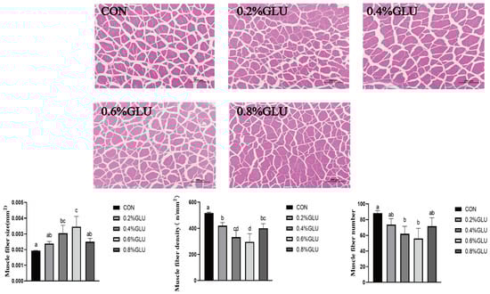 Effects of dietary Glu on muscle histology of largemouth bass. Means in the same row with different superscripts are significantly different (mean ± SD; ANOVA, p < 0.05; n = 3).