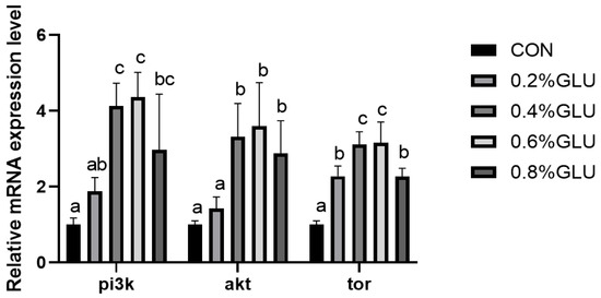 Effects of dietary Glu supplementation on the relative mRNA expression levels of phosphatidyl inositol 3 kinase (pi3k), protein kinase B (akt), and target of rapamycin (tor) in the muscle of largemouth bass. Means in the same row with different superscripts are significantly different (mean ± SD; ANOVA, p < 0.05; n = 3).