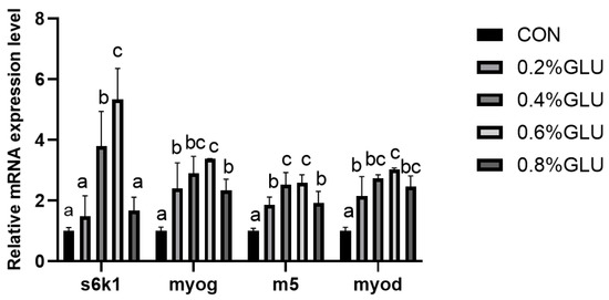 Relative mRNA expression level of 70 kDa ribosomal protein S6 kinase 1 (S6K1), myoblast determination protein (myod), myogenin (myog), myogenic factor 5 (myf5) in the muscle of largemouth bass fed Glu diets. Means in the same row with different superscripts are significantly different (mean ± SD; ANOVA, p < 0.05; n = 3).