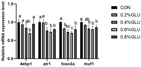 Relative mRNA expression level of eukaryotic translation initiation factor 4E-binding protein 1 (4e-bp1), forkhead boxO3a (foxo3a), muscle-specific RING finger protein 1 (murfF-1), and atrogin-1 in the muscle of largemouth bass fed Glu diets. Means in the same row with different superscripts are significantly different (mean ± SD; ANOVA, p < 0.05; n = 3).