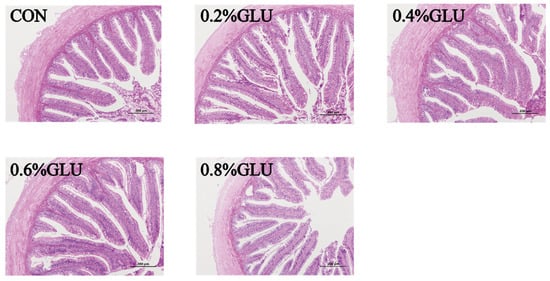 Compared to the control group, the villus height of the 0.4% Glu group was substantially higher (p < 0.05). The width of the 0.6% Glu group was substantially greater than that of the control group (p < 0.05). The thickness of the intestinal walls did not significantly differ across the groups (Table 7 and Figure 5).