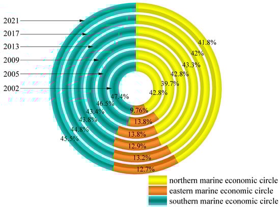 Figure 2 shows the proportion of marine fishery carbon sinks in the three marine economic circles, and the marine fishery carbon sinks of the three marine economic circles have always shown the trend of southern > northern > eastern, with the fishery carbon sinks of the southern marine economic circle remaining between 43% and 48%, the marine fishery carbon sinks of the northern marine economic circle residing in the range of 39% to 44%, and the fishery carbon sinks of the eastern marine economic circle fluctuating between 9% and 14%.