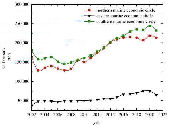 Provincial average fishery carbon sinks in the three marine economic circles.