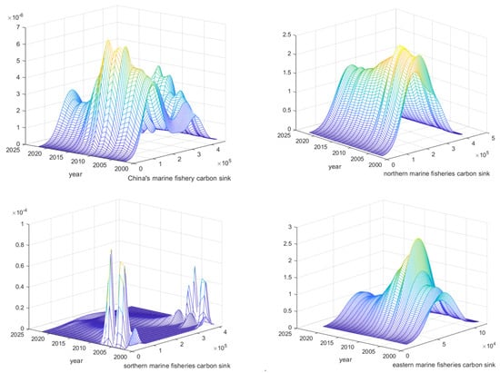 Kernel density estimation is an important tool for studying spatial disequilibrium. By using a continuous smooth kernel function to intuitively characterize the spatial distribution of random variables, reflecting the distribution of the object of study, such as the location of the distribution, morphology, and planning features and other dynamic information, it is both robust and can reveal the dynamic evolution of the distribution of the marine fisheries’ carbon sink capacity of the three marine economic circles in the spatial pattern. The basic principle is to use a smooth kernel function to fit the measurements to obtain the density curve, and then analyze the dynamic changes in the measurements based on the density curve. The kernel function has various functional forms, and the less the grouped data, the greater the probability of choosing the Gaussian kernel function [], therefore, this paper adopts the Gaussian kernel function to estimate the carbon sinks of the marine fisheries in the three marine economic circles.