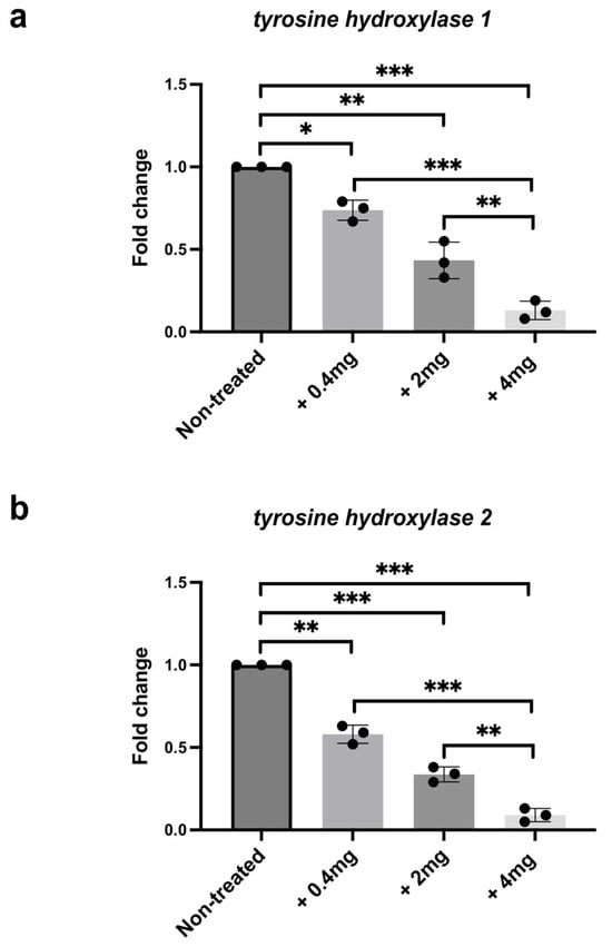 Previous studies have identified two tyrosine hydroxylase genes expressed in zebrafish: th1 and th2 []. We analyzed the transcript level of both genes in the brains of nickel-treated and untreated zebrafish. As shown in Figure 2, qPCR analysis reveals a dose-dependent decrease of th1 and th2 expression levels in the brains of treated zebrafish compared to the control ones (Figure 2a,b).