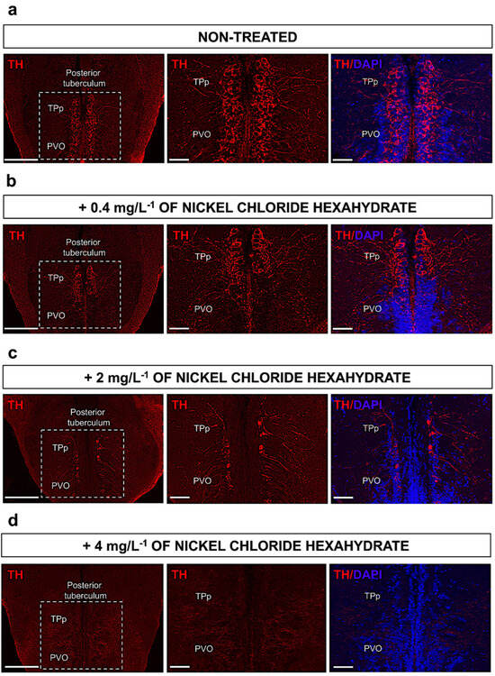 (a) Low magnification (scale bar 100 µm) of TH-expressing cells in control (non-treated) zebrafish scattered in the periventricular nucleus of the posterior tuberculum (TPp) and paraventricular organ (PVO). White rectangle is a zoom region and high magnification (scale bar 50 µm) of TH-expressing cells in posterior tuberculum and DAPI (cell nuclei). (b) Low magnification (scale bar 100 µm) of TH-expressing cells of zebrafish treated with 0.4 mg L−1 of nickel chloride hexahydrate scattered in the periventricular nucleus of the posterior tuberculum (TPp) and paraventricular organ (PVO) and high magnification (scale bar 50 µm) of zoom region of TH-expressing cells in posterior tuberculum and DAPI (cell nuclei). (c) Low magnification (scale bar 100 µm) of TH-expressing cells of zebrafish treated with 2 mg L−1 of nickel chloride hexahydrate scattered in the periventricular nucleus of the posterior tuberculum (TPp) and paraventricular organ (PVO) and high magnification (scale bar 50 µm) of zoom region of TH-expressing cells in posterior tuberculum and DAPI (cell nuclei). (d) Low magnification (scale bar 100 µm) of TH-expressing cells of zebrafish treated with 4 mg L−1 of nickel chloride hexahydrate scattered in the periventricular nucleus of the posterior tuberculum (TPp) and paraventricular organ (PVO) and high magnification (scale bar 50 µm) of zoom region of TH-expressing cells in posterior tuberculum and DAPI (cell nuclei).
