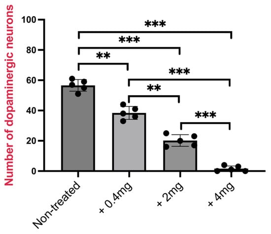 - Matsui, H.; Sugie, A. An optimized method for counting dopaminergic neurons in zebrafish. PLoS ONE 2017, 12, e0184363. [Google Scholar] [CrossRef] [PubMed]