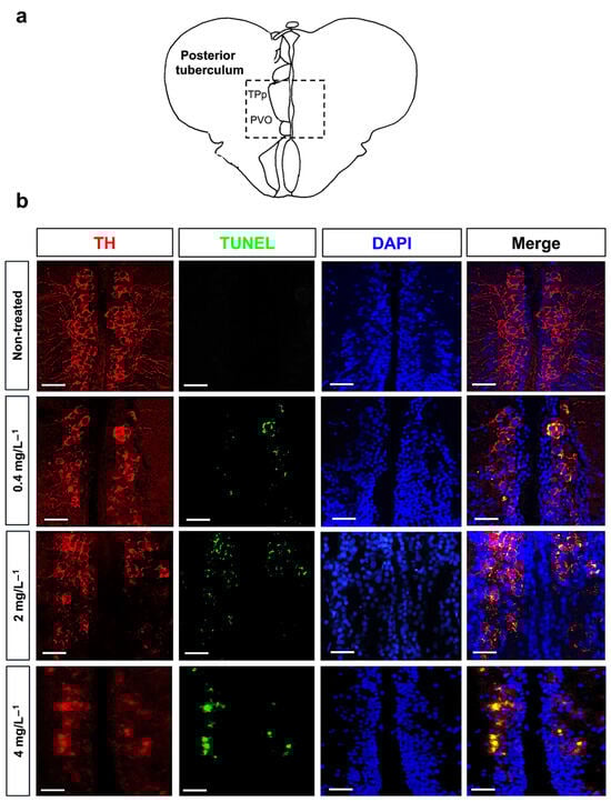 (a) Representative section of posterior tuberculum region, the periventricular nucleus of the posterior tuberculum (TPp) and paraventricular organ (PVO). (b) TH-positive cells (in red), TUNEL-positive cells (in green), DAPI (blue), and merge in posterior tuberculum of nickel-treated and control (untreated) zebrafish. Confocal microscope, scale bar 50 µm.