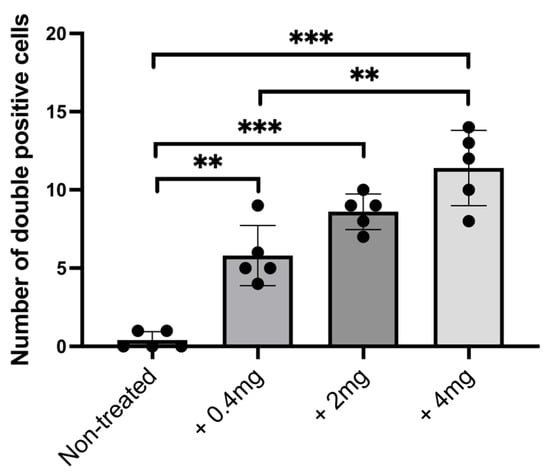 After detection of TH by immunofluorescence, the signal was checked using a fluorescence microscope, and the sections were fixed for 10 min in 2% paraformaldehyde. Next, the sections were incubated with 90 µL of labeling solution plus 10 µL of enzyme solution (In Situ Cell Death Detection Kit, C10617-Roche, Basel, Switzerland) at RT for 1 h, as described in a previous study []. They were washed three times with PBS for 5 min and mounted. Finally, the images were examined via confocal microscopy. Stained sections were photographed using a confocal Nikon Eclipse 90i microscope.