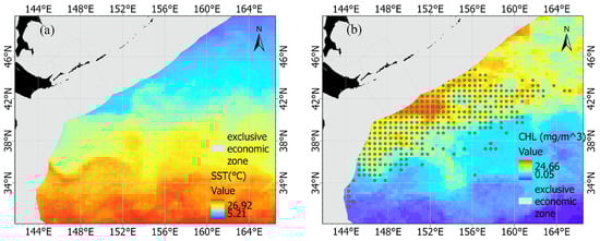 Previous studies demonstrated that SST (°C) and CHL (mg/m3) could have a significant impact on the catch and distribution of chub mackerel resources [3,9,11,28,29,30]. Therefore, SST and CHL were included in the model of the present study. The monthly averaged SST (Figure 1a) and the monthly averaged CHL (Figure 1b) were acquired from Oregon State University’s Ocean Productivity database (http://sites.science.oregonstate.edu/ocean.productivity/, accessed on 1 June 2022), and these data were resampled to a spatial resolution of 0.5° × 0.5°.