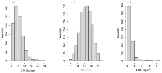 Data distribution of (a) CPUE, (b) SST, and (c) CHL.