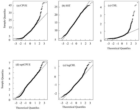Normal distribution QQ chart of original (a) CPUE, (b) SST, (c) CHL, (d) sqrtCPUE, and (e) logCHL.